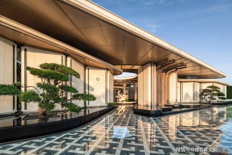 首先映入眼帘的,是约60米长的恢弘气派门庭,碧水叠景与苍劲迎客松相映成趣,以非凡的尺度与意境,奠定归家的尊崇礼序。地面由橄榄绿配星河灰拼花铺装,叠水景观点缀。入口两侧迎客松福泽庇佑,归家之仪自有气韵。