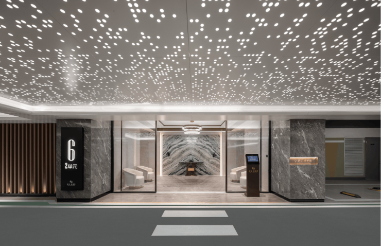 绿城黄浦湾地库入口及楼栋入户光厅均采用星空顶设计,地库入口墙面设计了灯光拉线,公共过道区域都采用了格栅吊顶和灯带,质感十足。