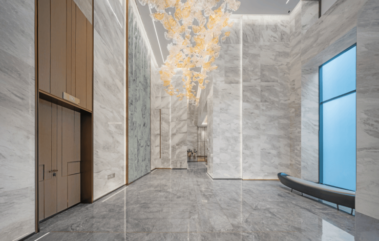楼栋入户大堂是业主地面归家的必经之地,项目也同样采用了相当精致且高标的设计。