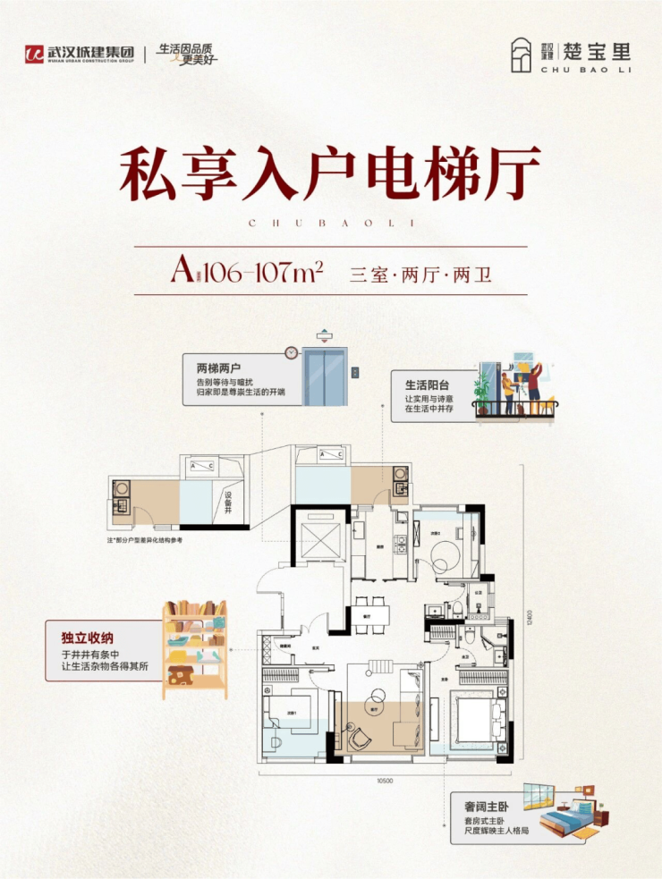 建面约106㎡“大容量”三房:入户私厅、步入式储藏间、北向生活阳台、无界通厅;