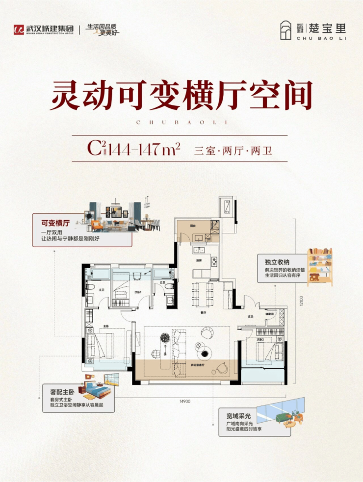 建面约143㎡“可变型”三+一房:户型可成长、南向大横厅、南北双阳台、LDKB无界通厅。