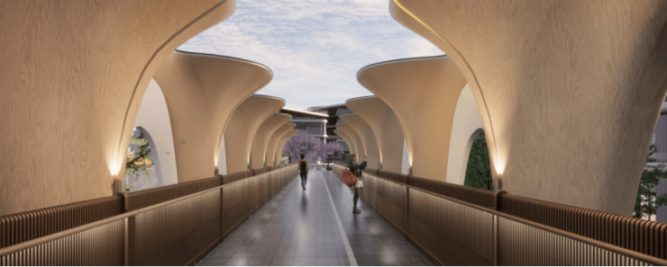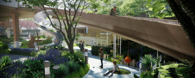下楼就是未来市集、绿谷街区、理想跃动馆、韧性公园……高线云廊将所有生活场景无缝串联。