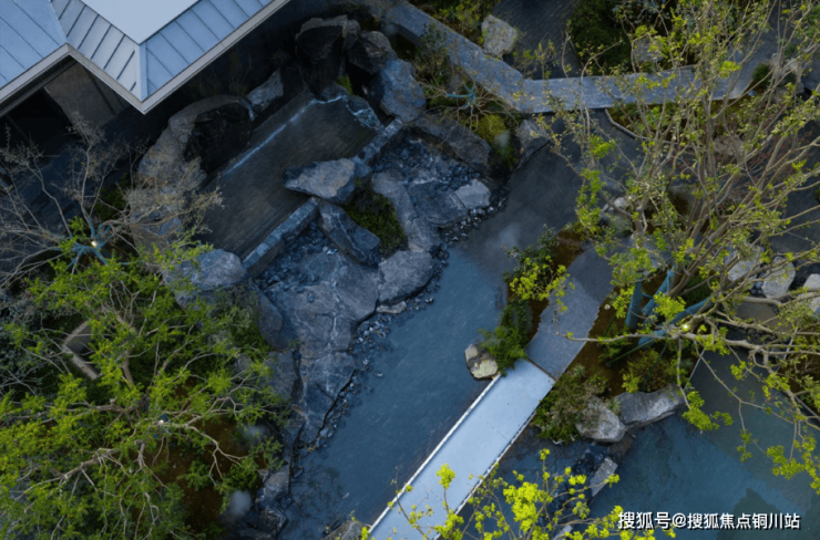 立于下沉庭院,耳畔是飞瀑流水,眼前是石桥倒映澄澈水面,四周绿意盎然,俨然一派闹中寻静的都市“桃花源”。