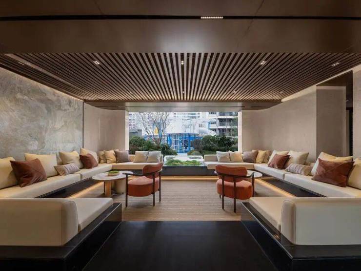 入户大堂与地下大堂通过圆弧造型、回型吊顶等设计语言形成呼应。首层大堂约265平方米,运用镜面拓展视觉空间,顶面金属漆质感细腻,防火门均做隐形处理,实现视觉统一。