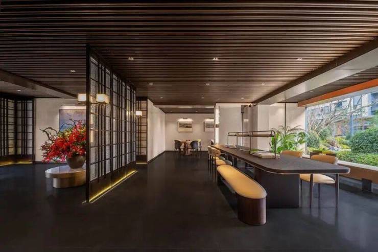 西侧宽约百米的的酒店式门庭,百万级的迎客松,以苍翠温润的力量感,续写着时间的故事。迪奥米黄景墙的细腻肌理,以东方隔景智慧,轻柔地划分内外。
