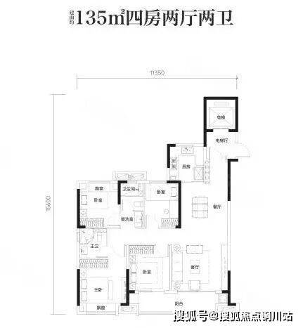 135户型分布在2号楼的最西头,做到了4房带独立电梯厅,南北通透,三开间朝南,两开间朝北,这也是整个项目高层商品房源中最好的一个户型。