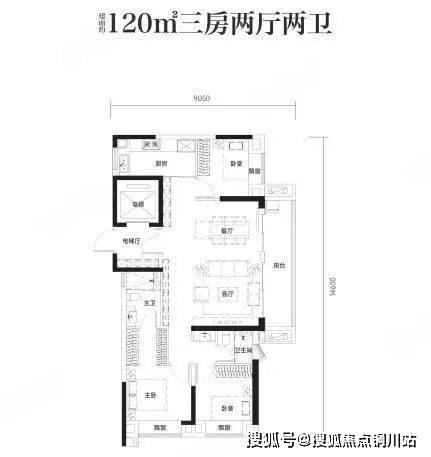 120户型分布在2号楼2单元的中间,也是三开间朝东,次卧、卫生间以及厨房朝北。