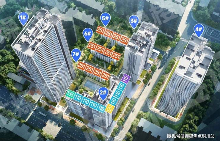 其中5、6、7号楼为总高4层的叠拼,1号楼是总高53层的超高层,2号楼为总高33层的高层。