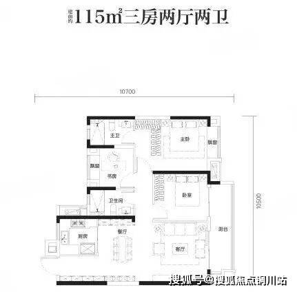 115户型分布在2号楼1单元的最东头,三开间朝东,次卧、卫生间以及厨房朝北。