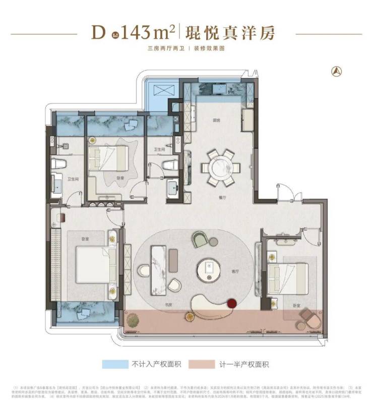 2026年1月琨悦真洋房启幕; 建面约143㎡琨悦系新一代作品备受瞩目,近100%实得率成就理想生活封面,带来媲美建面约180㎡户型的墅级体验。