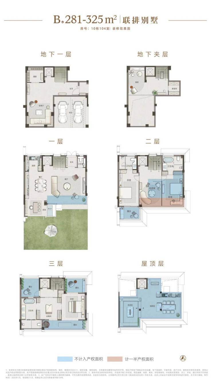 ● 首创“一墅六园”的空间规制,以约186%的超高实际使用率,为每位家族成员打造专属天地。(以B户型建面约281-325㎡展示样板10-104为例)