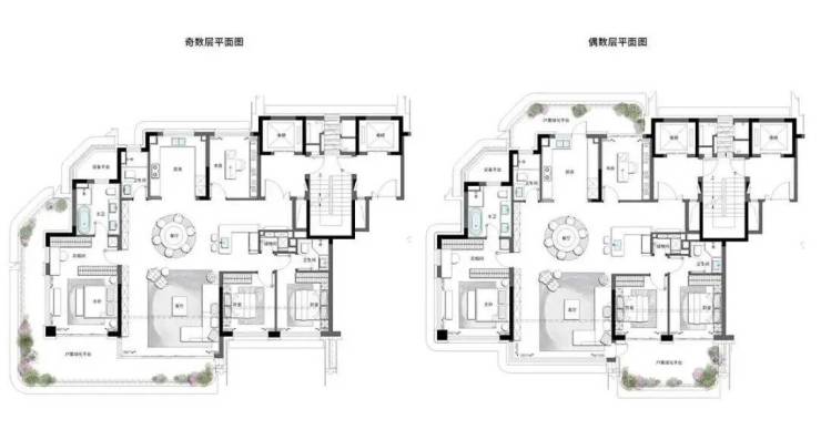 户型①上叠280 m²精装修风格为国际雅奢风格,由LSD设计,打造强社交感的上叠样板间, 独立中、西社交餐厨、客厅与露台空间联动、配置主卧独立衣帽库、私区家庭厅、花园露台场景等。