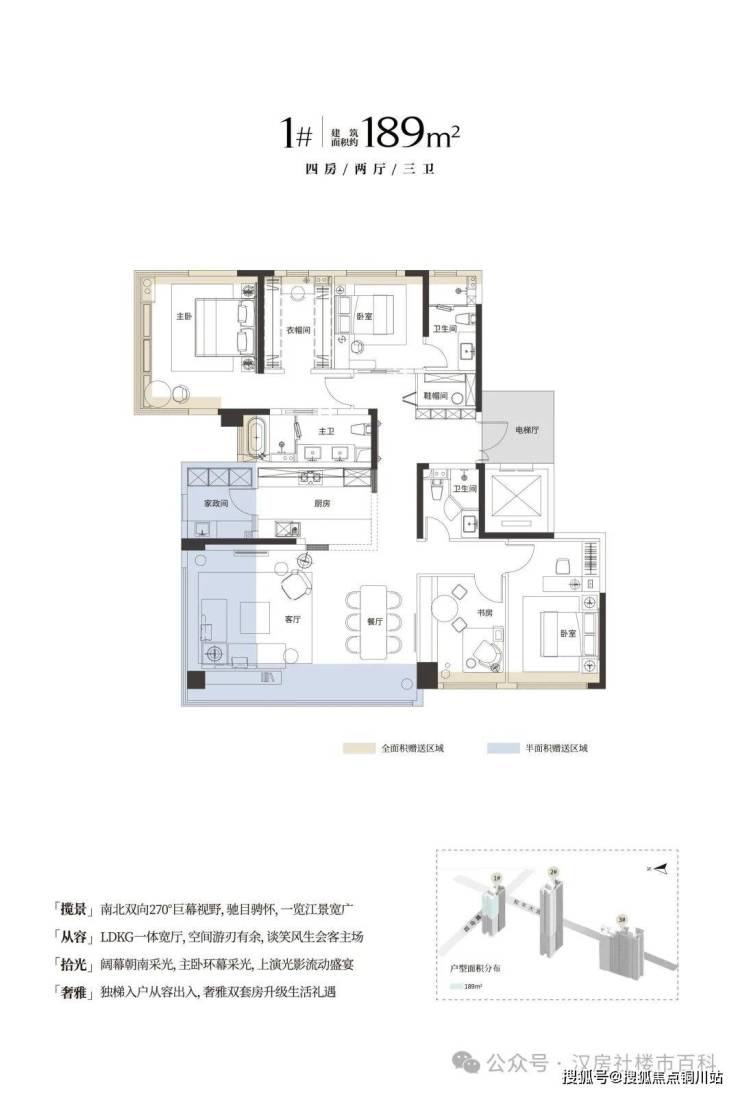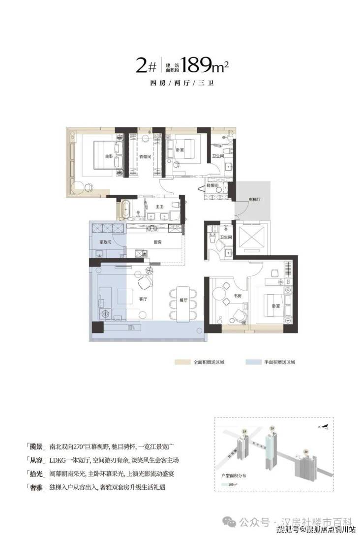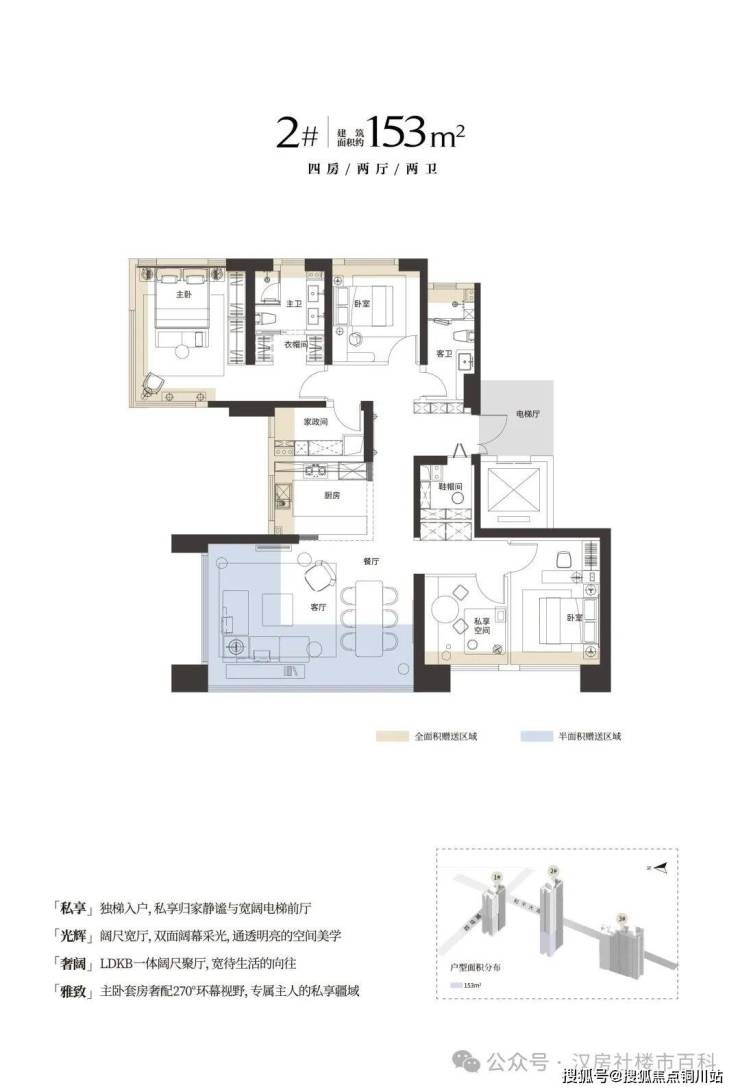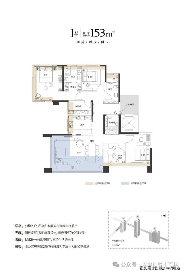 该户型位于1号楼16 层以上的西边户,南北双向的 270° 全景舱客餐厅和主卧套房,高层可观江,视野非常开阔。动静分区很清晰,独立的电梯入户,归家仪式感和私密感拉满。