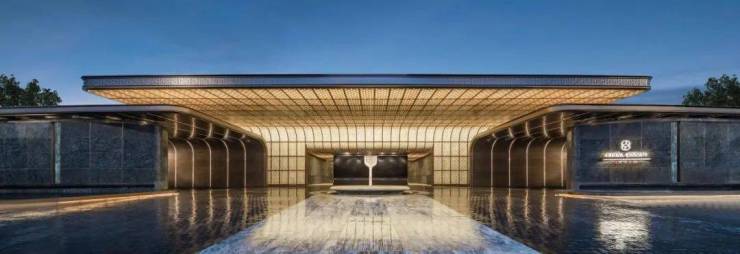 建筑立面的叙事更显深厚底蕴。设计师匠心独运,以“金镶玉带”为灵感,巧妙串联起中原文明的千年文脉。立面主色调汲取自青铜古鼎的斑驳古金,沉稳而内敛;露台之下,一道精心镶嵌的绿石玉带如点睛之笔,与古金色泽交相辉映,传递着璞玉般的温润光华与尊贵气质。