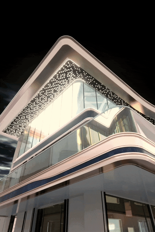 力生汉江序将现代科技与艺术结合,于屋檐顶部打造襄阳首个「星空冠」造型。金属质感铝板,结合高密度点状灯光,融合典雅与摩登,重构第四代豪宅的建筑表现。