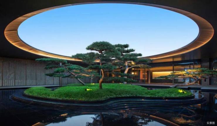 社区主入口柱子特选自巴西铂金钻奢石,呈现历久弥新的金属光泽,格栅照壁采用了4352块不锈钢拼接而成,青蓝色渐变彩釉陶板与青龙呼应。中庭水景历经219次石材切割、495道手工拉槽,构筑“天圆地方”水景庭院,居游之间营造度假式的园林生活。