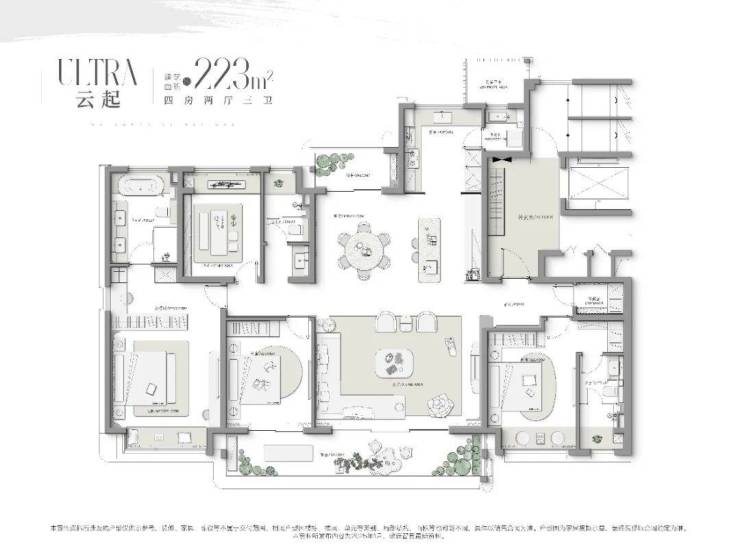 值得一提的是,狮山云起223㎡户型是区域目前同等面积中,唯一带南北双阳台的户型。多面采光的设计,模糊了室内外的界限,让南向约7000㎡中央景观的秀美、北向近1000㎡下沉庭院景观的旖旎,成为流淌进生活里的清风与阳光。