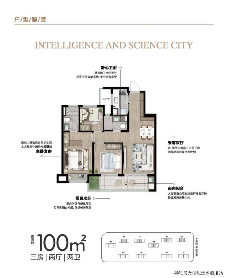以建面为100m²户型为例,大开间短进深,结合南向三面宽,充分拉开采光面,畅享清风对流;餐客双厅一体化设计,为一家人的互动留足空间,聚餐、观影、休闲、娱乐样样全能;套房式主卧设计,独立卫浴、衣帽间,让生活的私密与尊崇兼而有之。