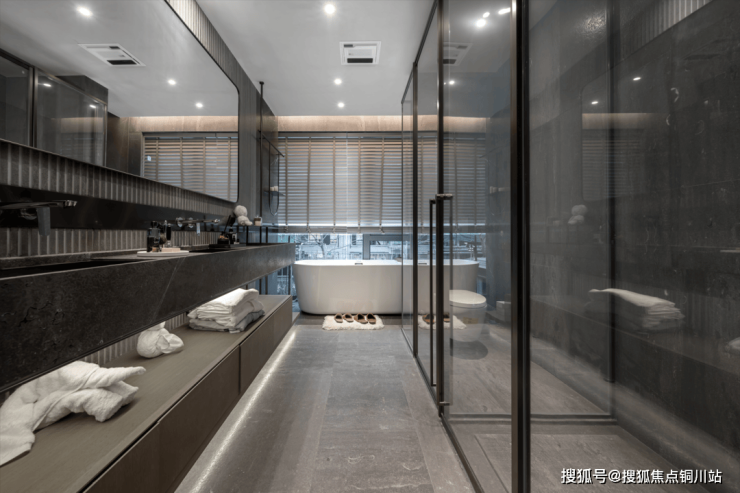 下面是主卧男衣帽间,配备超大浴缸和双盥洗台,尊享且气派。旁边是女衣帽间,各类名贵装饰尽收囊中。
