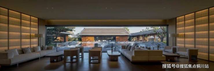 从室内中看向方庭,落地窗将庭间山水云雾框于其间,舒适的环境与禅意的美景一举两全 。坐于幽谷松林间,烹茶共叙,其达此生的生活空间,塑造与谁同坐此,知茶共叙时的意境。