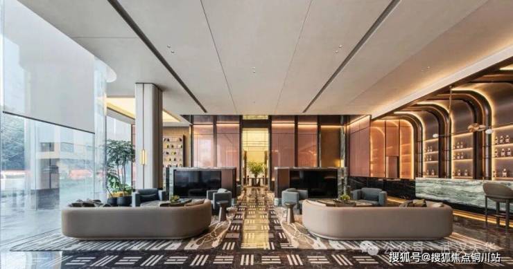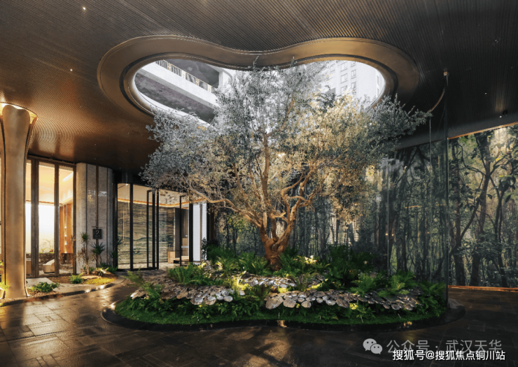 穿过这道极具仪式感的“翅膀”,精心设计的双重归家动线随即展开,一条经由酒店式会所,提供精致且具仪式感的通行体验;另一条穿过与自然融合的前庭花厅,在灰空间与自然元素中完成从街道到社区的空间转换。两条流线独立并行,回应不同归家场景下的空间需求。
