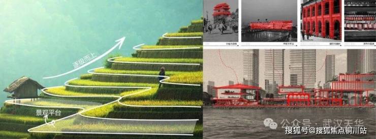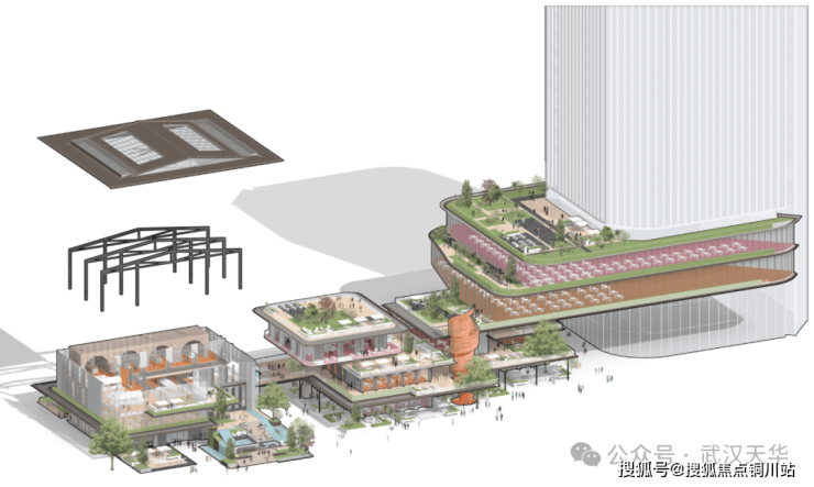 ·对外的城市客厅:同时,商业街区以开放的姿态融入城市。其设计借鉴了武汉独特的“码头文化”与“船舰”意象,通过层叠如梯田的退台、模仿邮轮甲板的观景平台、以及融入“拱券”语言的空间结构,营造出尺度宜人、充满探索趣味的街区氛围。这里将成为区域新的社交目的地,吸引城市人群前来消费、漫步、观江。