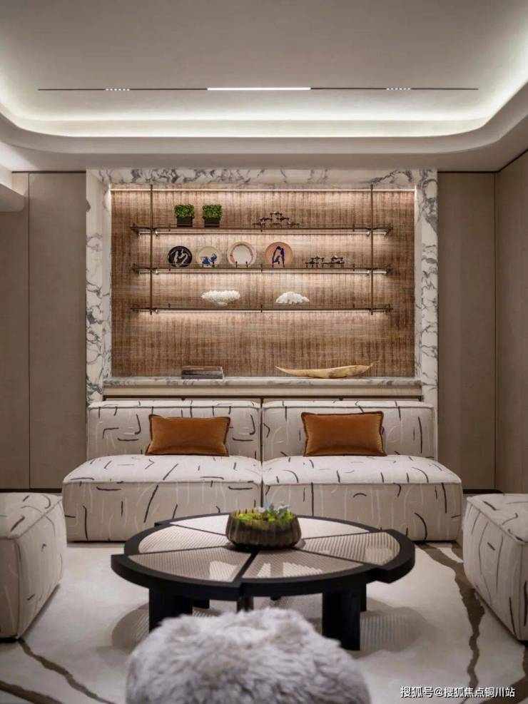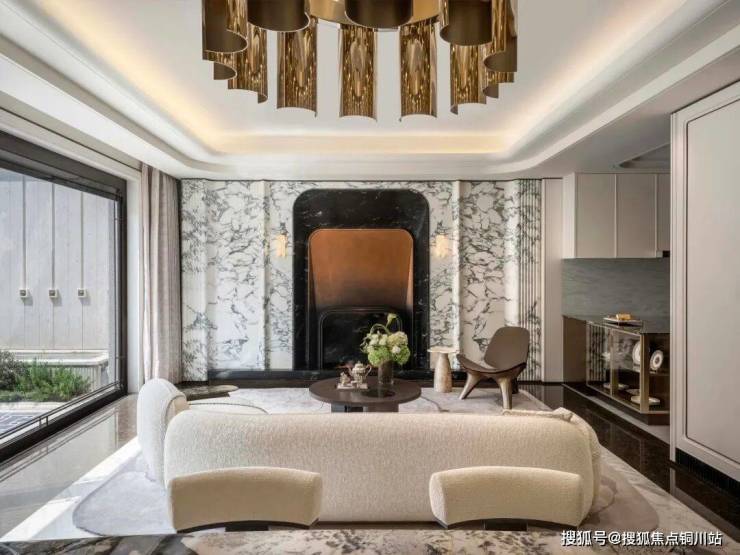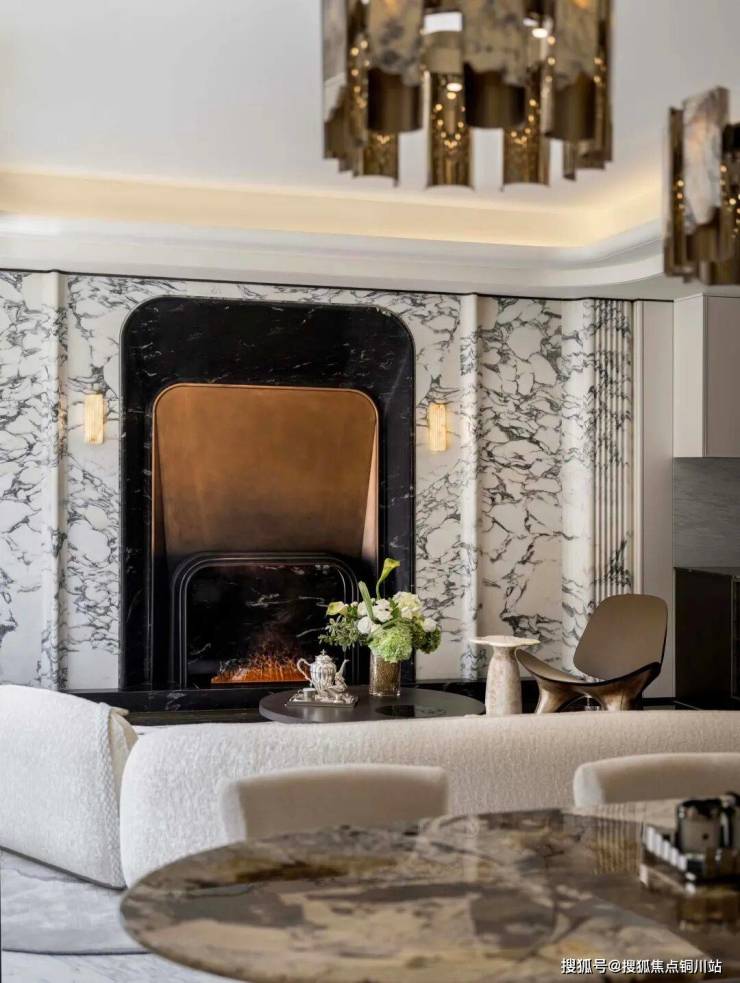 客厅的墙面采用影木结合大理石的拼接装饰,大气奢华彰显品质,结合水雾壁炉,让家庭更具温馨的氛围感。