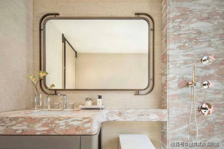 次主卫以柔纱粉调天然石材构筑,轻盈中透出浪漫气质,搭配Kallista 002系列龙头与花洒,芙蓉水晶把手从奢华珠宝中汲取灵感,并带来大自然的疗愈力,于方寸之间,诠释优雅细腻的生活美学。