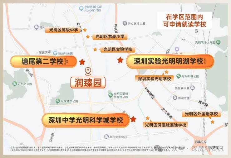 项目自带有1所9班制幼儿园,家门口约100米有1所九年制公办学校在建,另外根据光明区教育局2024年最新的学区划分,润臻园属于塘尾社区,小学学区划分在光明区外国语学校、凤凰城实验学校、光明区实验学校、玉塘学校、龙豪小学;初中学区划分在深圳中学光明科学城学校二部、光明高级中学、深圳实验光明学校。
