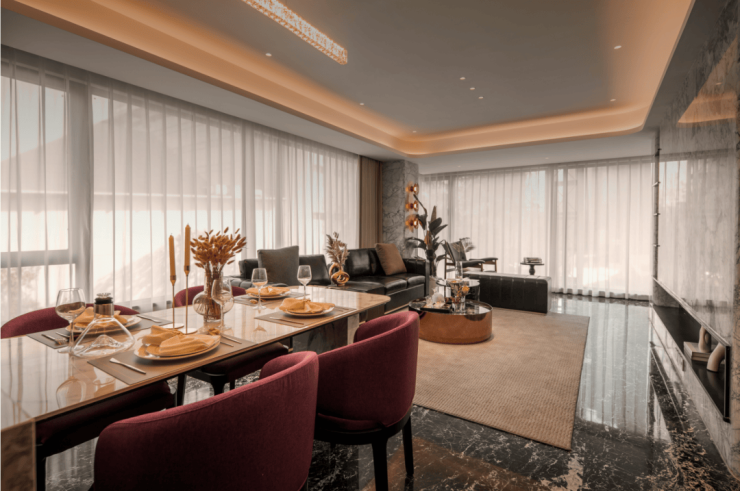 客厅、餐厅、阳台等相连,形成一个一体化奢阔约73㎡的家族聚会空间,同时宴请20余宾客也不觉拥挤。