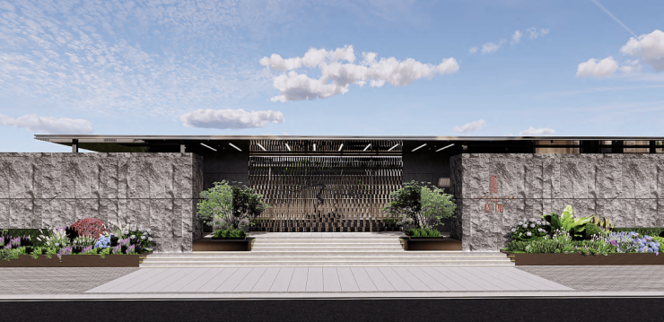 走近来看,约40m星级酒店式社区实景主大门,精选一整面别墅园林专用天然开山石料。高约6m的艺术化景墙,融入风铃幕墙元素,优雅金与高级灰巧妙结合,十分气派。