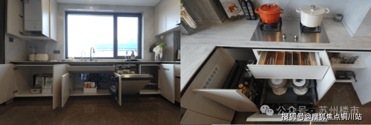 厨房,更是夸张,不只有上方柜体拉篮、下方碗篮抽屉、调料抽拉柜,水槽下面的还专门做了一个下翻抽。