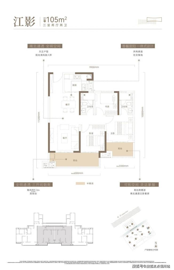 建面约105㎡户型三室两厅两卫,南向双打阳台长约9.9米,主卧套房设计,全明双卫,三代同堂也绰绰有余。