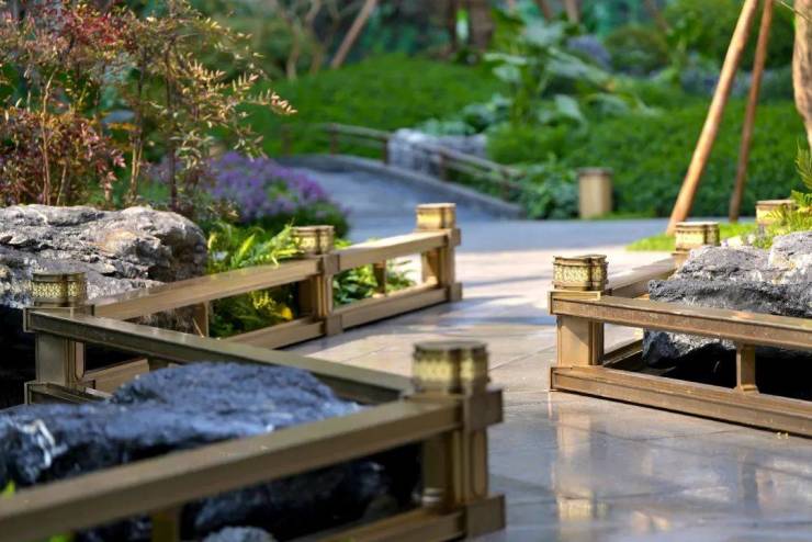 比如眼前的溪流,波光粼粼,仔细看,溪流地面材质,采用长条形的片岩,本身自成流水形态,与流动的溪水相得映彰。