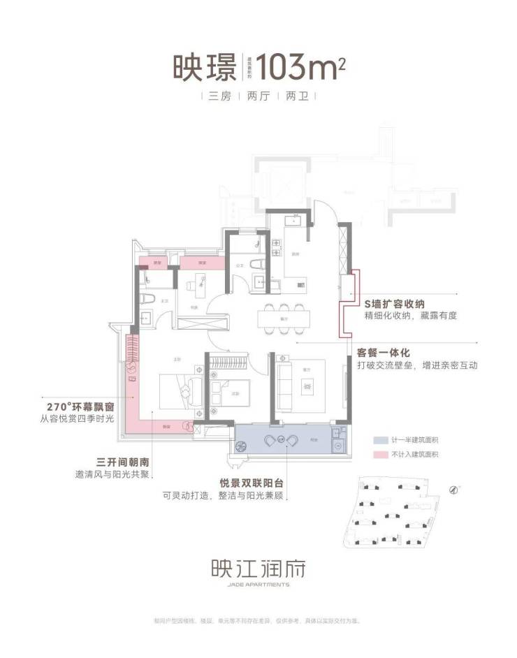 建筑面积约103㎡三房两厅两卫,不失为改善家庭的首选。其中边套户型,映江润府的主卧套房做了 270°环幕飘窗,实现无与伦比的采光通风和视野享受,类比于千万级豪宅的体验!