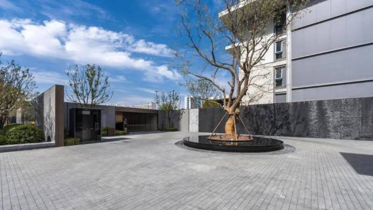大门的北侧是车马院的入口,这里设计了一个环岛落客区,出租车或网约车可以直接从侧门进社区,在环岛的中央,是一棵超百年树龄的元宝枫,整个胸径、树形、造价都刷新了郑西景观排面。