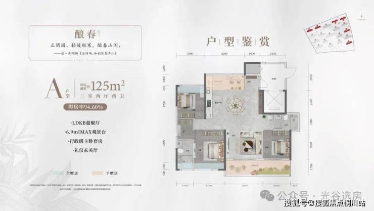 这是该盘的门槛户型,非真四代住宅设计,无空中花园。但是94.6%的得房率也相当高了。有将近7个平方的私享电梯厅,这个配置头一次出现在这个面积段的产品上。