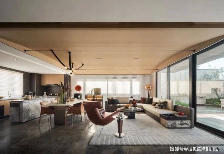 下叠餐客厅南向面宽约6.9米,还采用了270°采光设计,整个空间宛若被花园环抱,业主在绿意盎然的空间内,与自然无界互动,与亲人无间交流。