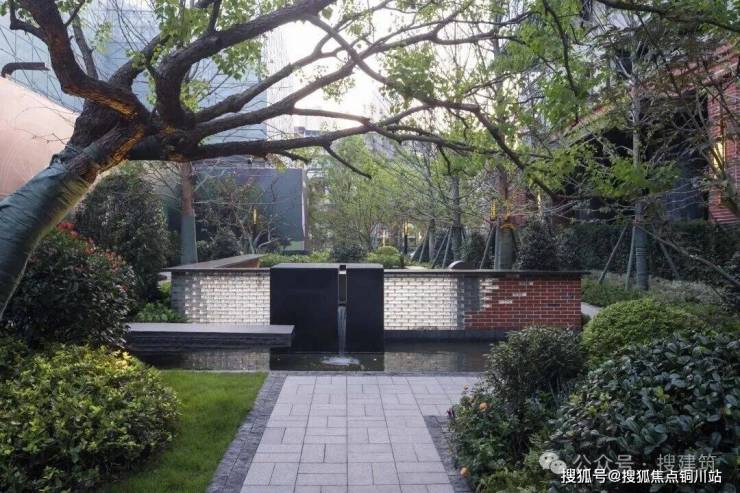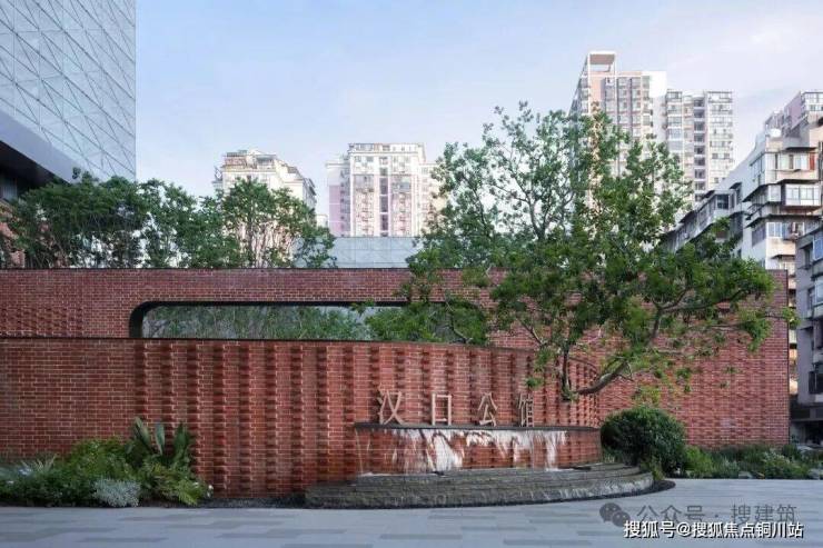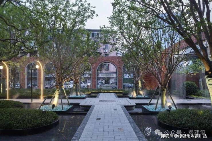 穿过红砖廊道,来到核心的“汉口荟聚”,镜面水景波光粼粼,倒映着四棵姿态优美的丛生紫薇,动静相宜。