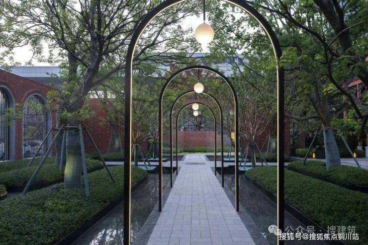 精致的金属地雕镶嵌于素雅复古的路面之上,将城市的历史印记低调而尊崇地融入现代生活场景。阵列排布的圆拱形金属构架延伸向深处,营造出强烈的归家仪式感,仿佛穿行在里份的拱券门廊下。