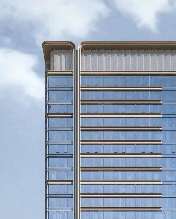 低层建筑立面则富有独特的韵味和美感,以精细框架搭配超大玻璃,通透纤巧,线条利落,同时选用暗金色铝板作为建筑主体色系,兼具内敛简约的特质与现代科技的美感。
