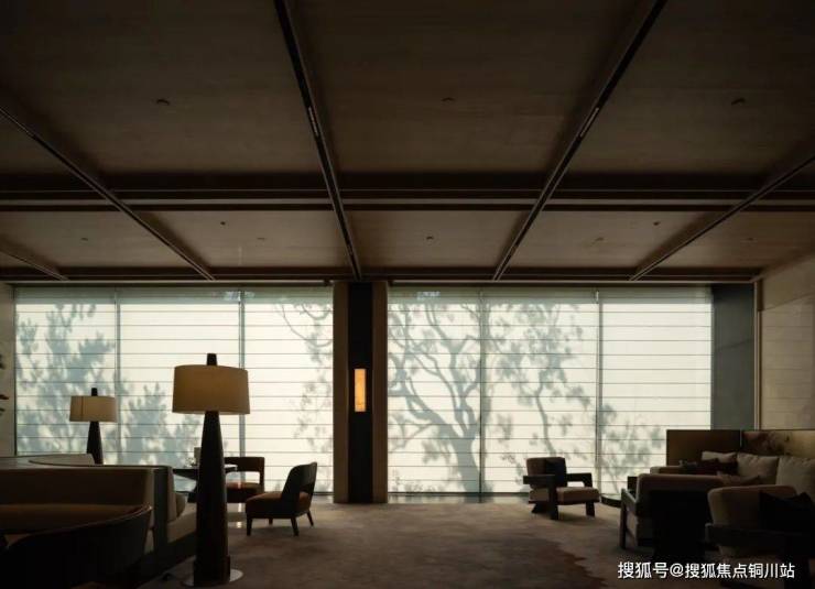 行政酒廊光帘落下,光为笔、树为墨,把下沉式庭院的树影借进来,与君同赏小窗明。