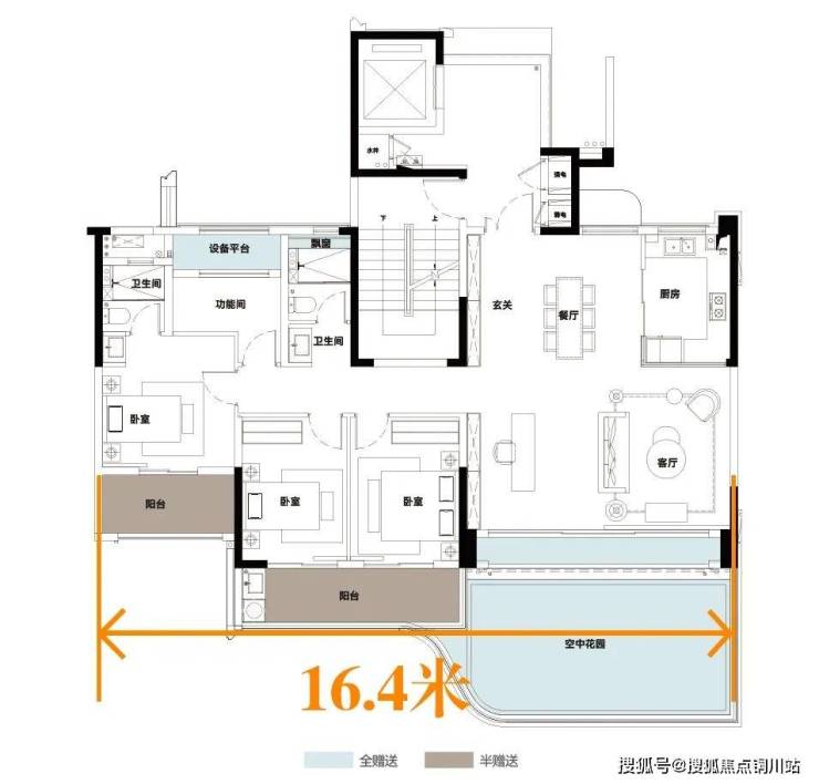 以即将面市的伍投·璞境建面约150平米的四代洋房户型为例,阳台+空中花园+设备平台+多飘窗+独享电梯前室的多赠送空间设计,合计拓展面积最高约能达到55平米(南北露台户型存有区别),实际空间可使用率高达约123%。而在部分135-159平米的底跃户型中,实际可使用率甚至可以达到约281%。