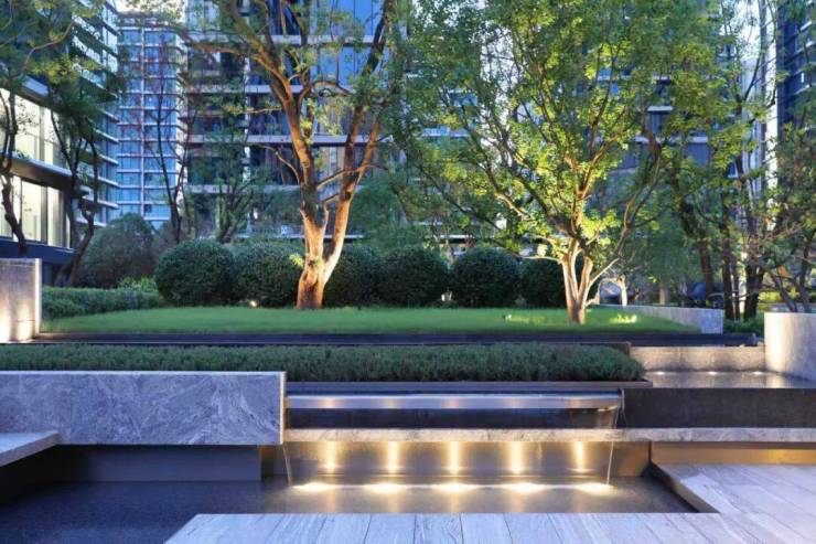 地面的天然奢石,单铺贴就多投入超1000万——“夜里雪”花岗岩铺就的园路泛着细腻哑光,“海浪灰”景墙映着水色轻晃,“安哥拉黑”拉槽面在光影中织就暗文。