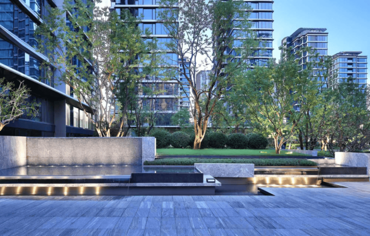 约66米横向水轴旁,12棵高达10-11米的乌桕树一字排开,只为让春夏翠绿、秋冬火红与雪白在水岸连成流动的画,“归家即度假”的静谧隐贵,便成了业主的日常。