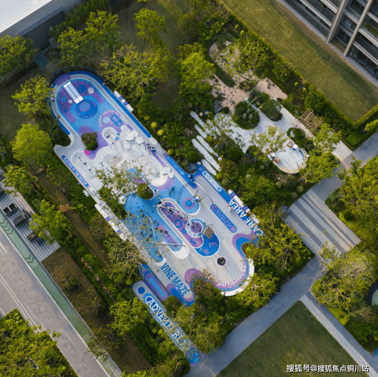 理想乐园与五感植物园,在自然中连缀成一片孩子们的快乐天地,梦幻紫的色调与翻折乐园彼此呼应,秋千、滑梯、云台、蹦床、攀爬……一场有趣的探险在此延续。