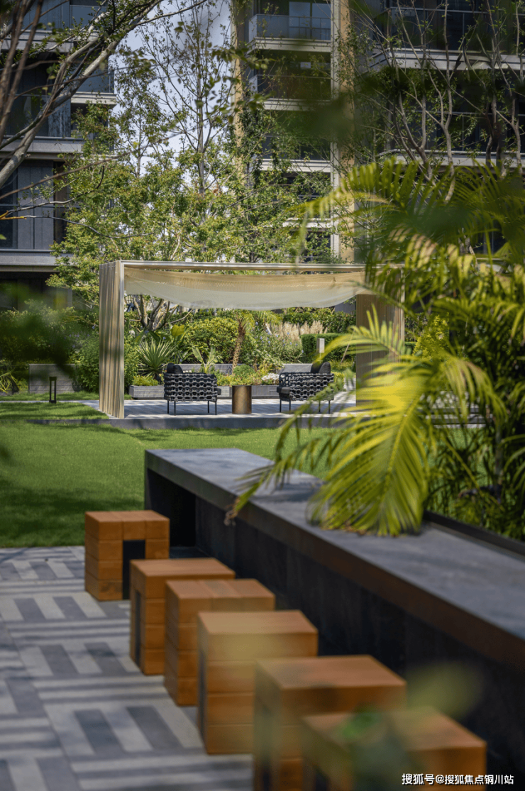 榉树林下错层大台阶围合成的半静谧星空剧场,精彩活动能够于此上演;层叠的草阶、流动的水与雕塑小景、自然木纹的连廊相映成趣,阳光躺坪与月光宝盒充满艺术的质感。