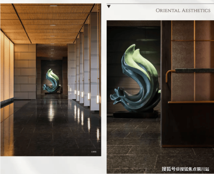 金箔墙上则以宁波的“云海翻涌、缥缈仙境”为灵感作画搭配进口的名贵龙鳞黑松掩映营造出一幅绮丽隐逸的生活画卷。