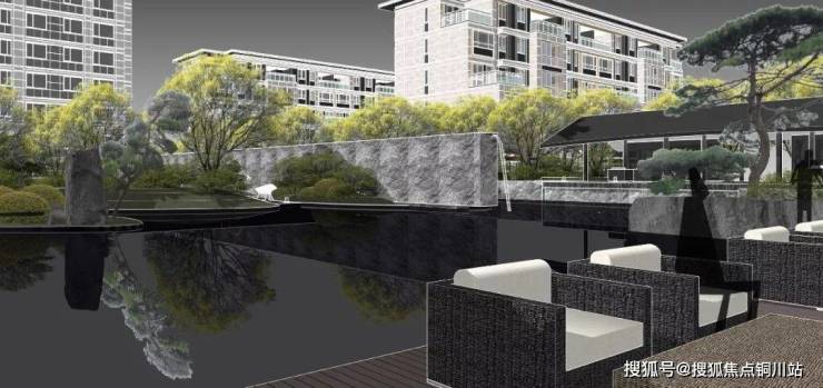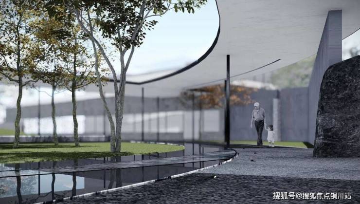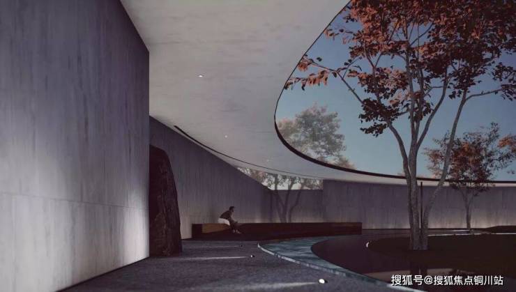示范区后场空间,开阔的圆形镜面水景映入眼帘,将超尺度弧形长廊和孤植造型松,从建筑到景观的空间构成完美的映射在水中,营造禅意雅致的后场花园。