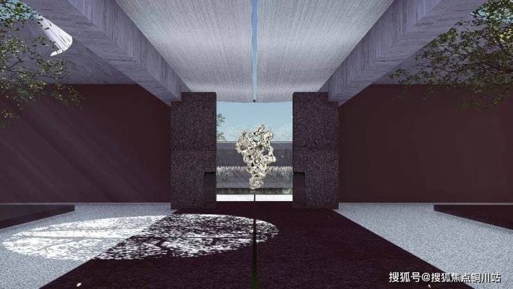 金属网帘,星星灯墙面,造型松和叠水景观,解构自然山水,营造神秘梦幻的盒中景观。